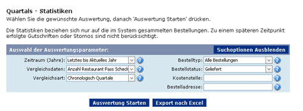 Bestücken Sie die Auswertungsmaske mit den gewünschten Parametern wie beispielsweise dem Bestellstatus und Kostenstelle. Folgende Auswertungsparameter sind vorhanden: